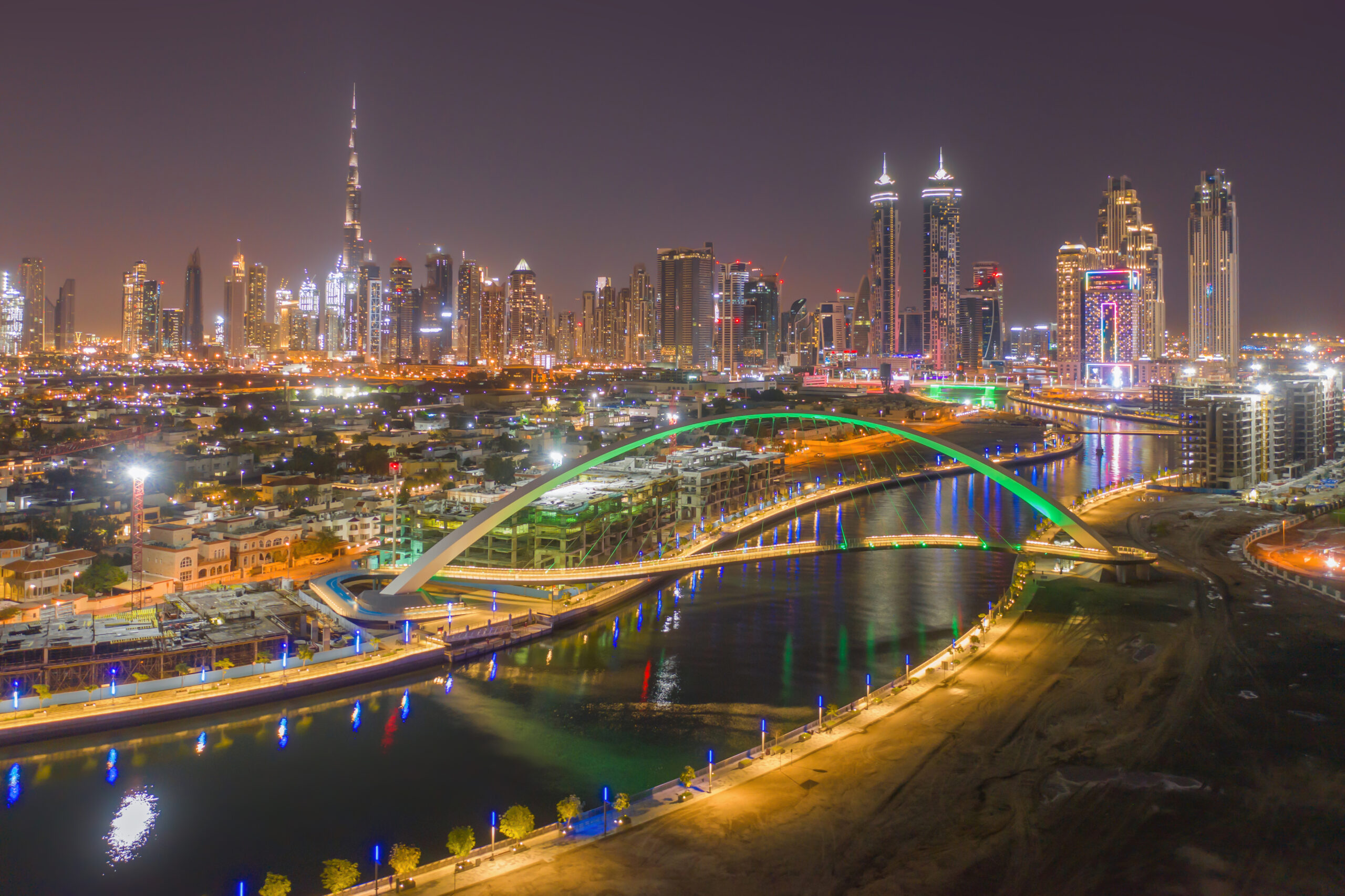 Aerial view of Tolerance bridge and Dubai downtown skyline. Structure of architecture with lake or river, United Arab Emirates or UAE. Financial district and business area in urban city at night.