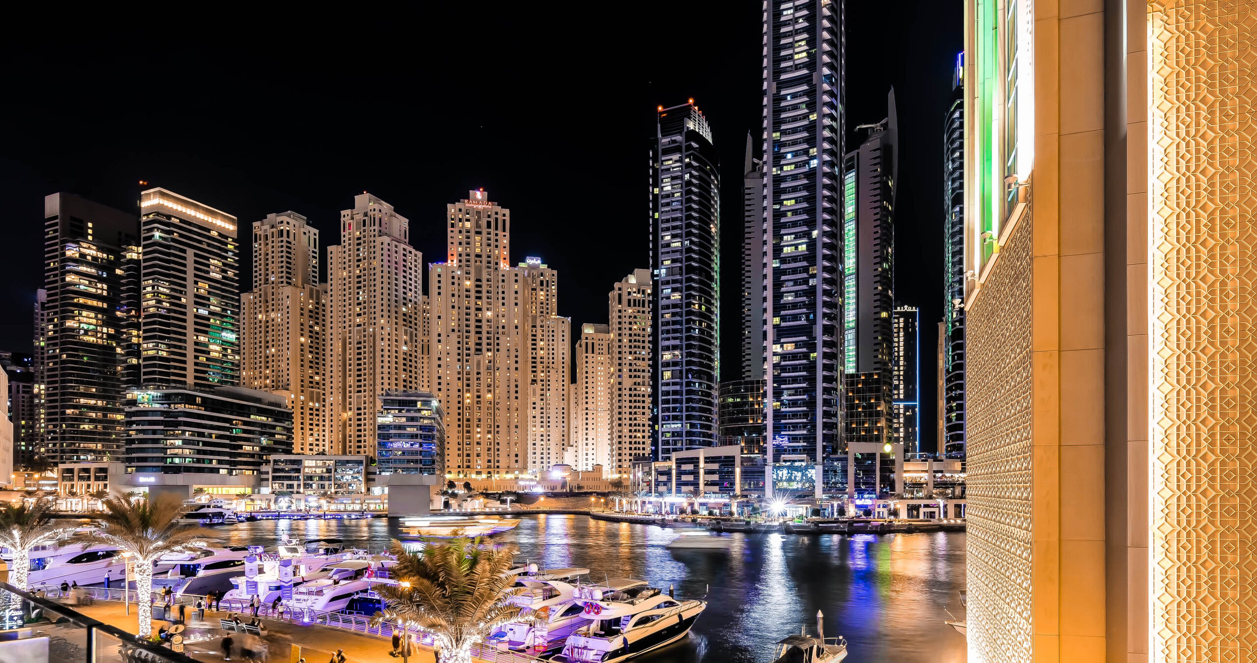 Dubai Marina skyline yacht harbor architecture travel at night twilight in United Arab Emirates